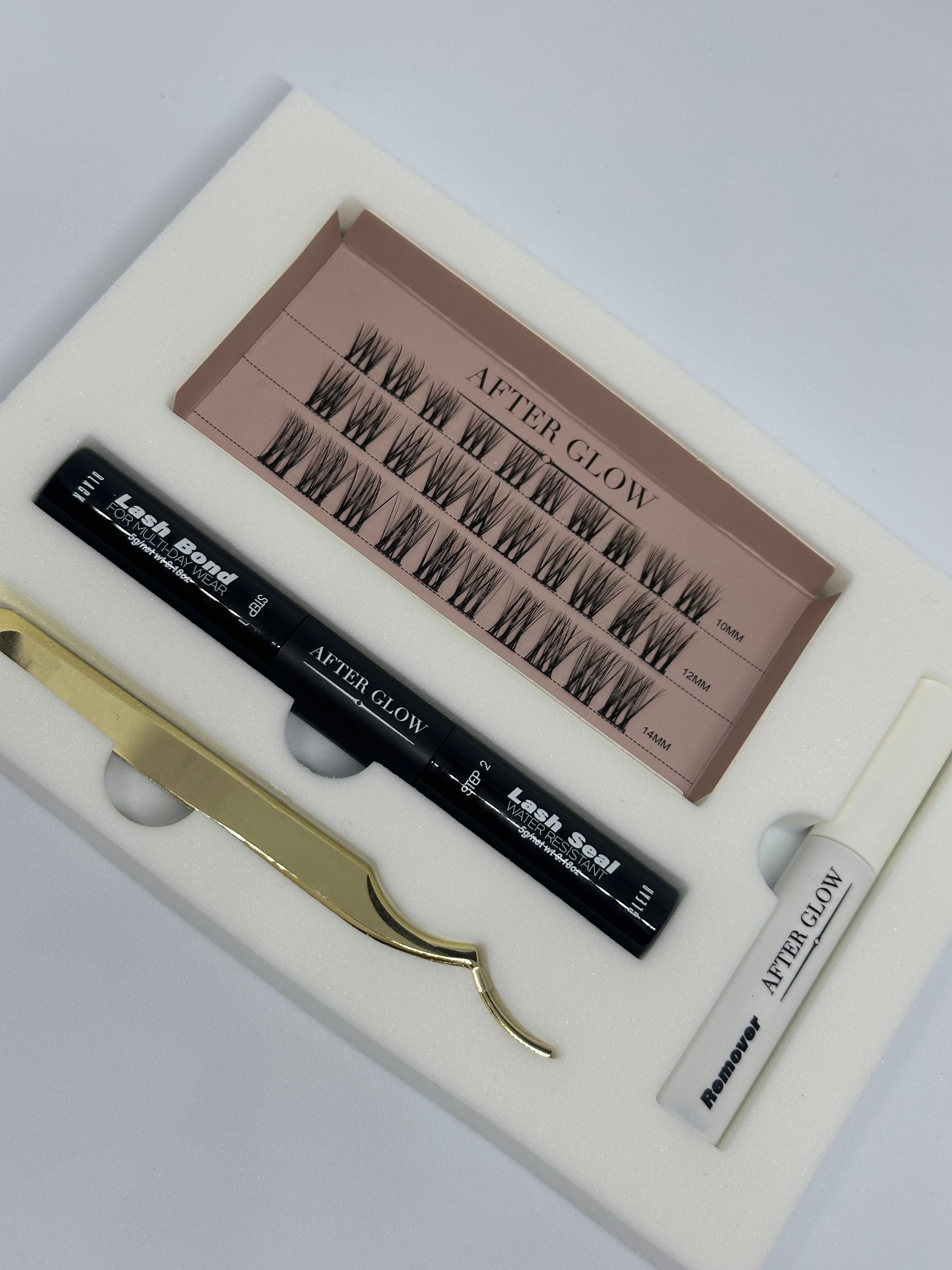 1. Brush a light coat or bond adhesive at the base of your natural lashes. Focus the adhesive where the base of the cluster will connect with your natural lashes. Gently remove cluster from tray and place underneath your natural lashes with the lash applicator.